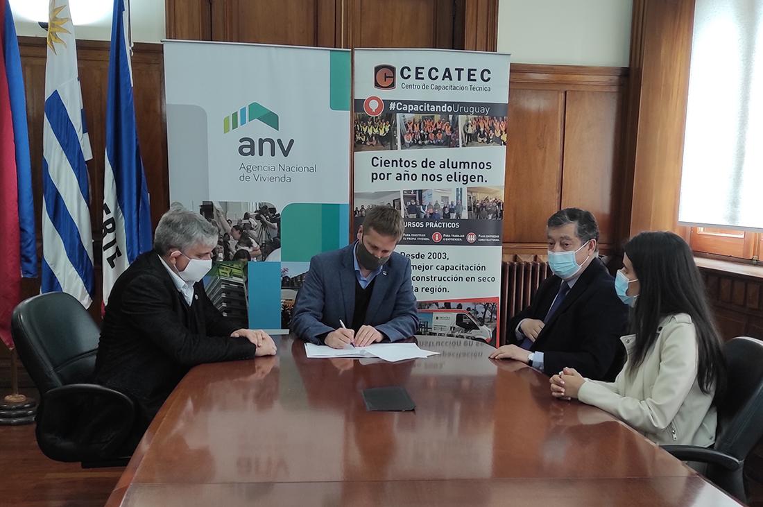 En la tarde del miércoles 13 de octubre, la Agencia Nacional de Vivienda (ANV) firmó un convenio con el Centro de Capacitación Técnica (CECATEC) por el cual funcionarios de la institución y sus familiares podrán tener acceso a los cursos que brinda la empresa para capacitarse en sistemas constructivos en seco.