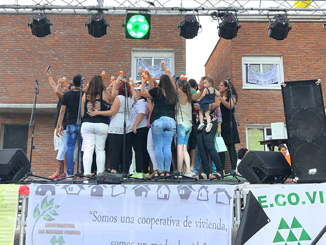 Embanderados bajo el lema "Somos una cooperativa de vivienda, somos un modo de vida", los integrantes de la cooperativa culminaron un proceso de cuatro años para acceder a su propia casa, bajo la modalidad de ahorro previo.