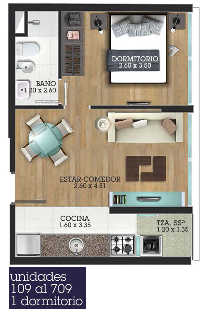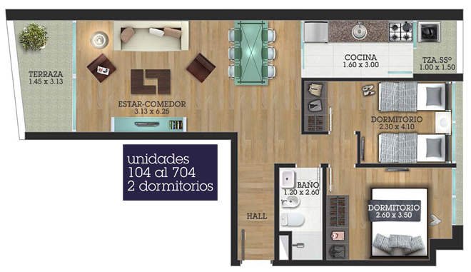 | Unidad | Dormitorios | Viviendas | Baños | Área Habitable (m2) | Área Construida (m2) |