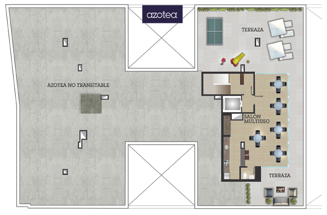 En los niveles 1 al 7, se proyectan 10 unidades de vivienda (5 de 1D y 5 de 2D) distribuidas en dos bloques paralelos, conectados por un núcleo central de viviendas, con patios reglamentarios de aire y luz; nivel 8 se ubica el SUM.