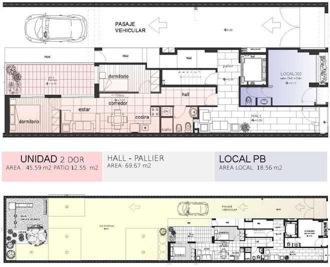 n planta baja se ubica un local comercial al frente, y una vivienda de 2 dormitorios, además de cochera al fondo con plaza para 6 autos; plantas nivel 1 al nivel 5, con 2 unidades de vivienda de interés social (1 de 1D y 1 de 2D); y por último a nivel de azotea se ubican dos parrilleros de uso común de todo el conjunto.